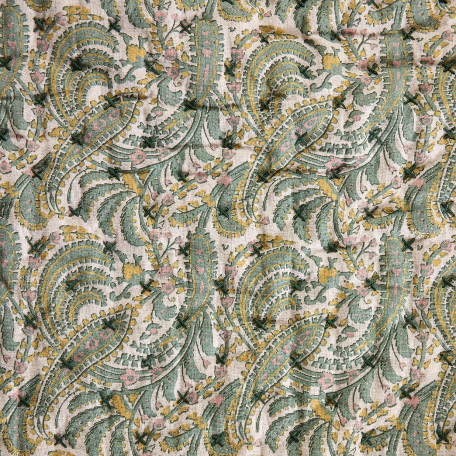 L’édredon Padma revisite le motif cachemire dans une version verte fraîche et colorée. Le côté verso uni rend possible un usage réversible et un changement de style immédiat.