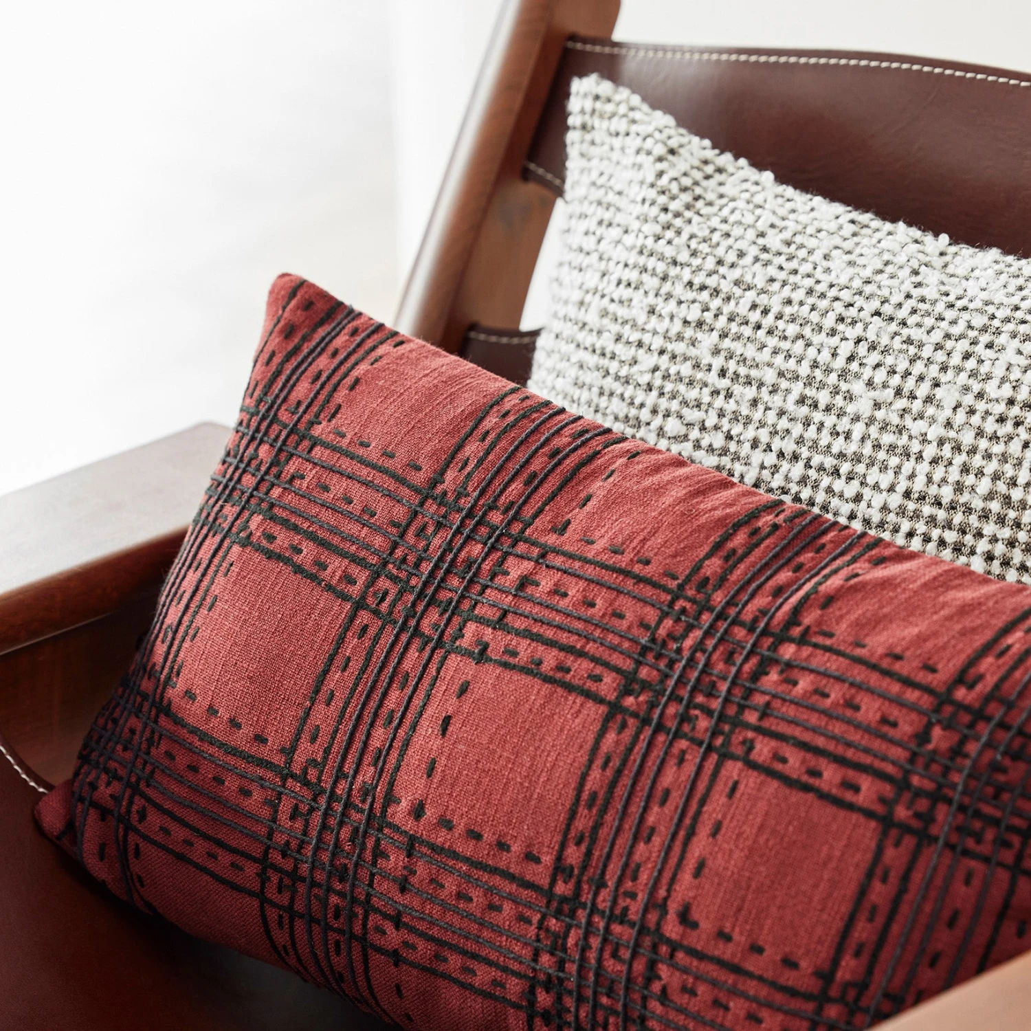 Le motif Keneth réinterprète le carreau. Double-face, cette housse est brodée sur le recto, et le verso est uni en coton épais.
