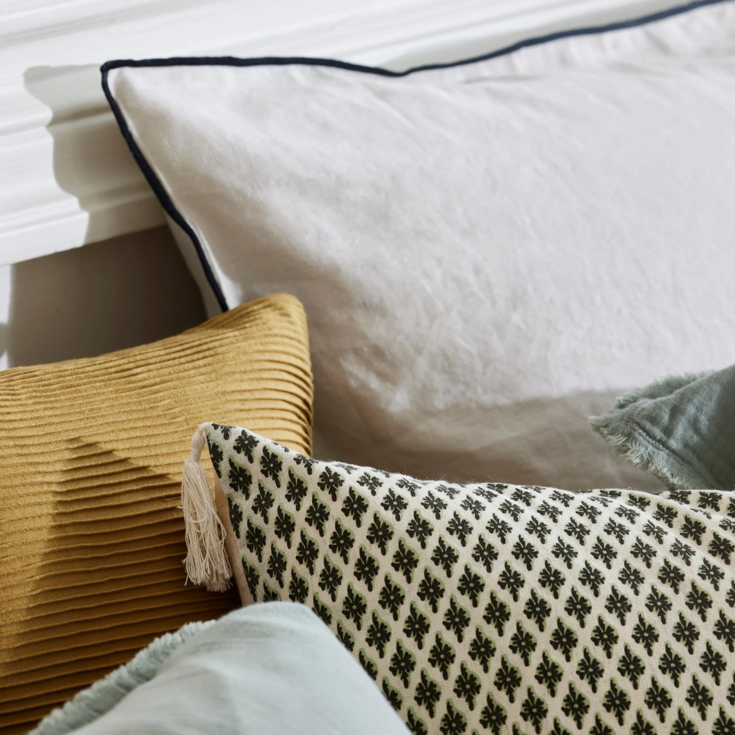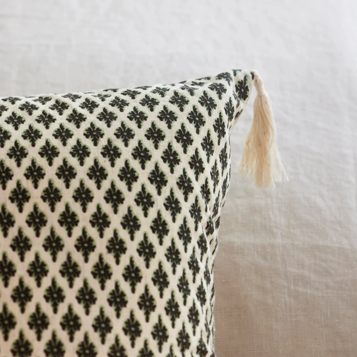 La housse de coussin Sanjay est un micro motif graphique qui allie modernité et tradition. Inspiré des motifs au block print indiens de nos archives, il s’imprime sur un très joli métis coton lin, et est fini de simples pompons de coton.