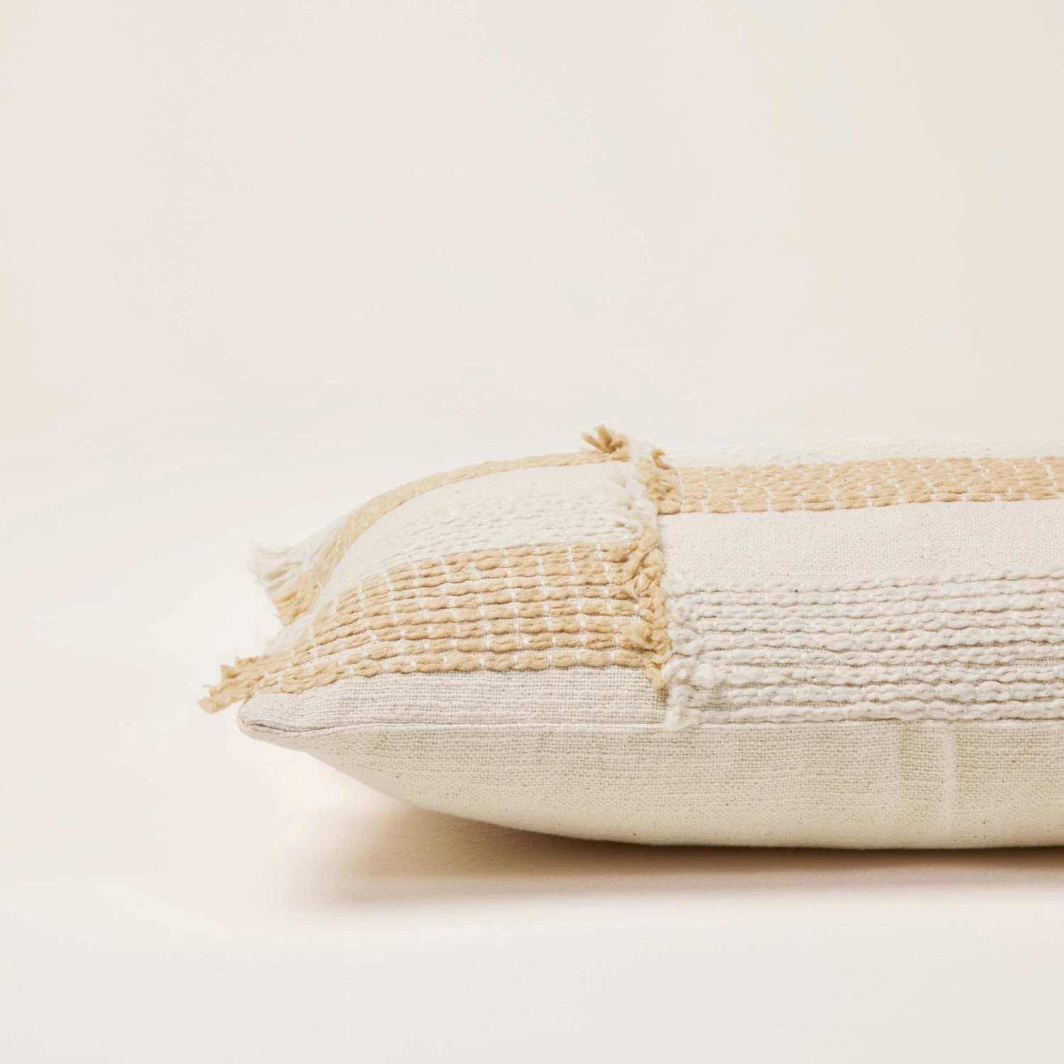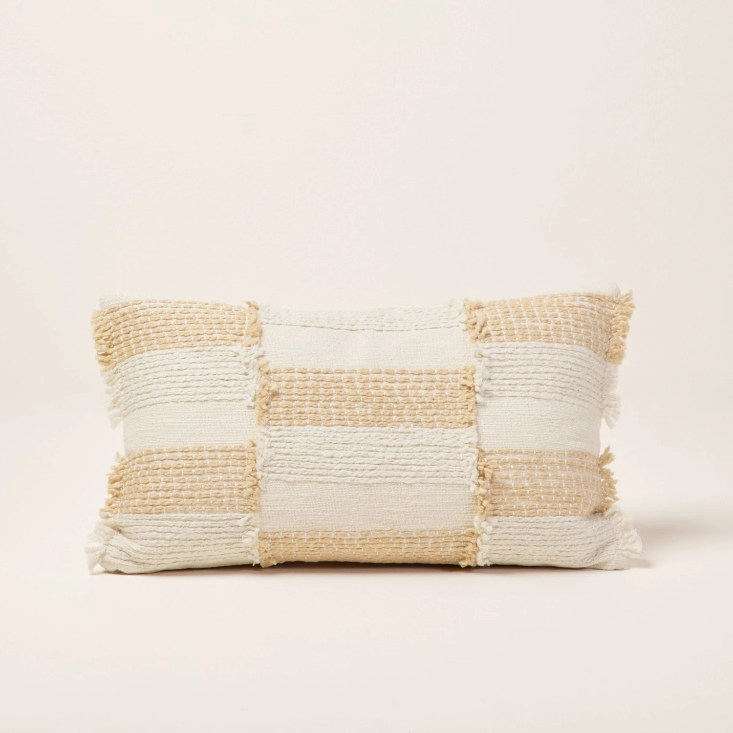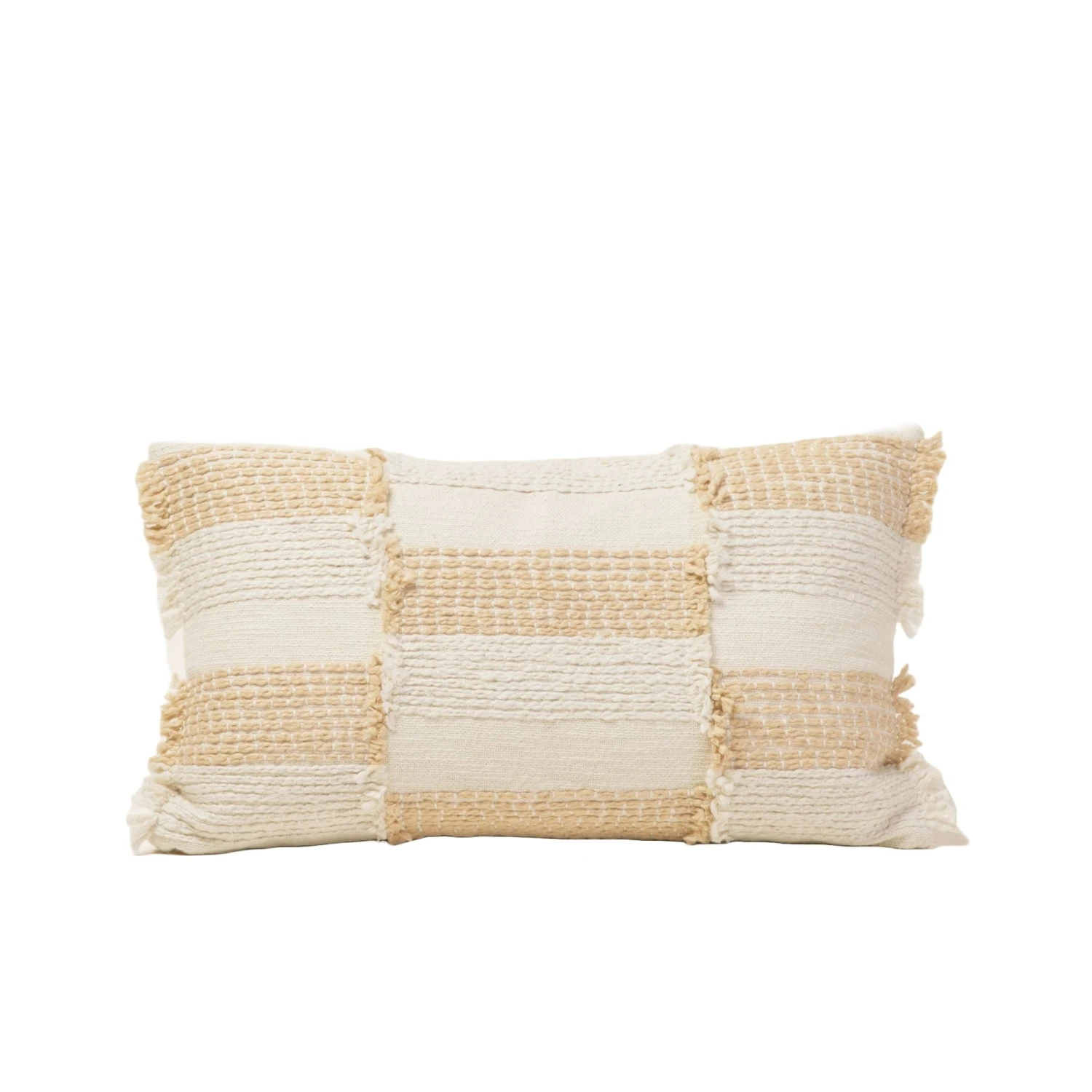 La housse de coussin rectangulaire Silas offre une belle réinterprétation du motif brique. D’épaisses mèches de coton sont appliquées dans des teintes en camaïeu de grège, beige sable et lin.