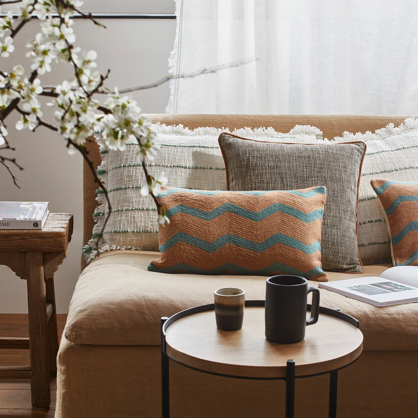 Les coussins Taha ivoire et sauge apportent douceur et légèreté à votre intérieur avec leurs rayures tissées et leurs finitions frangées bicolores.