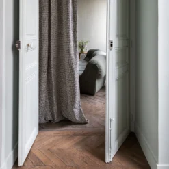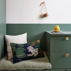 Décliné sur une toile de coton, le motif Tigris issu et retravaillé à partir d’une archive Madura fait penser aux jungles naïves du Douanier Rousseau.