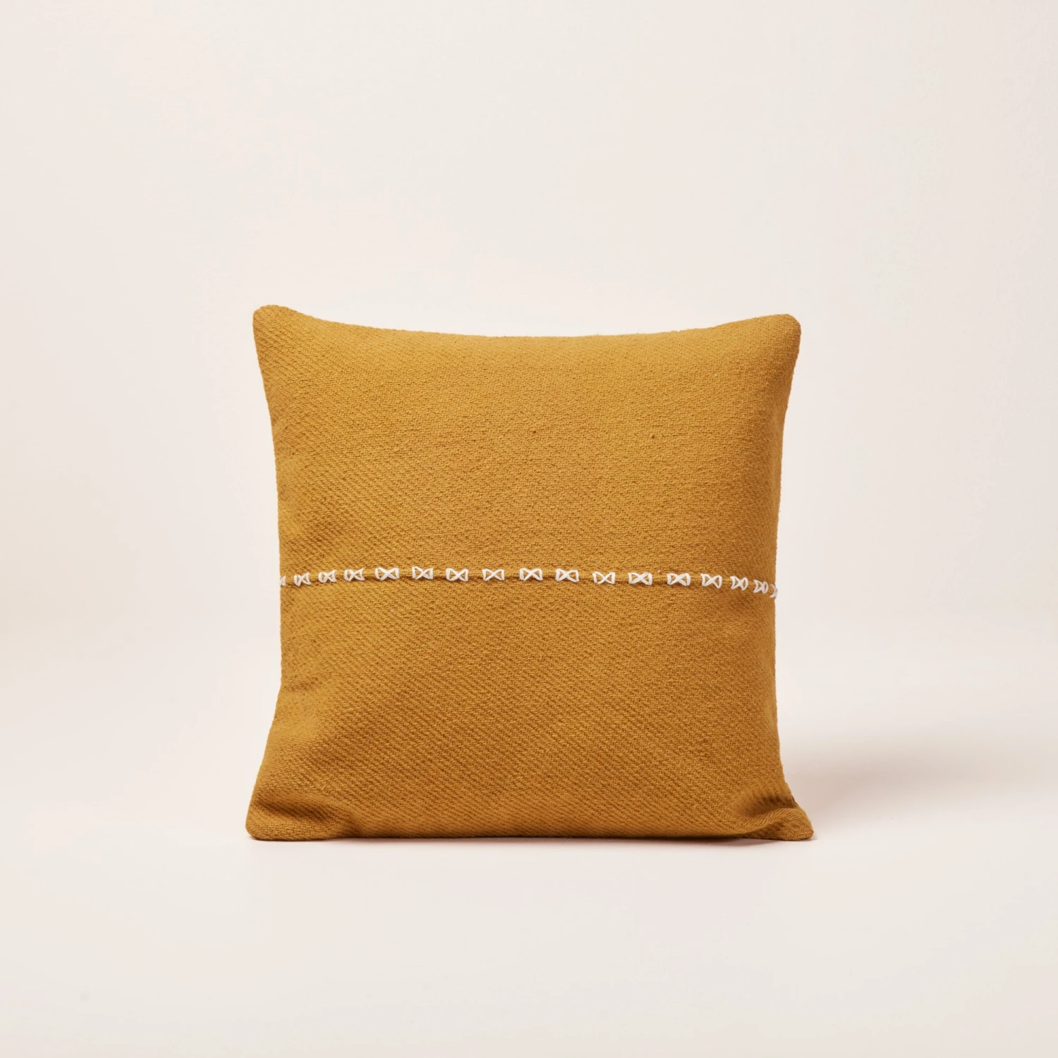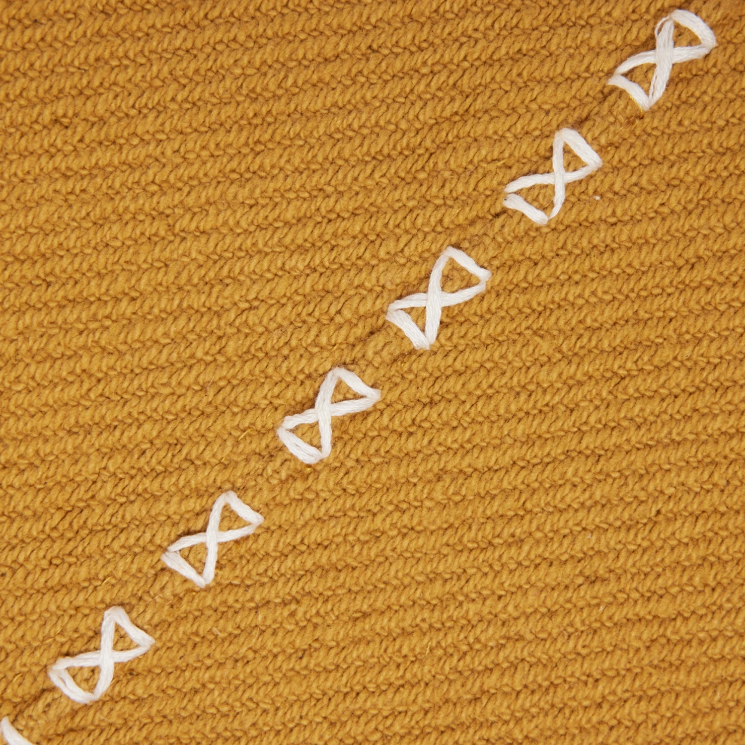 La housse de coussin Waliss jaune curry est en sergé de coton rebrodé d’un point en fil épais contrasté.