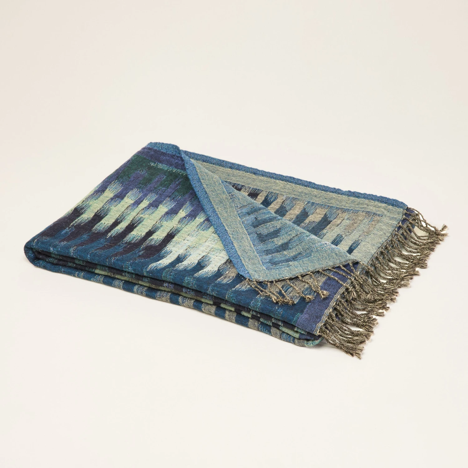 Comme sur une toile abstraite, les couleurs de ce plaid en pure laine se mêlent et se confondent pour former un motif ikaté graphique.