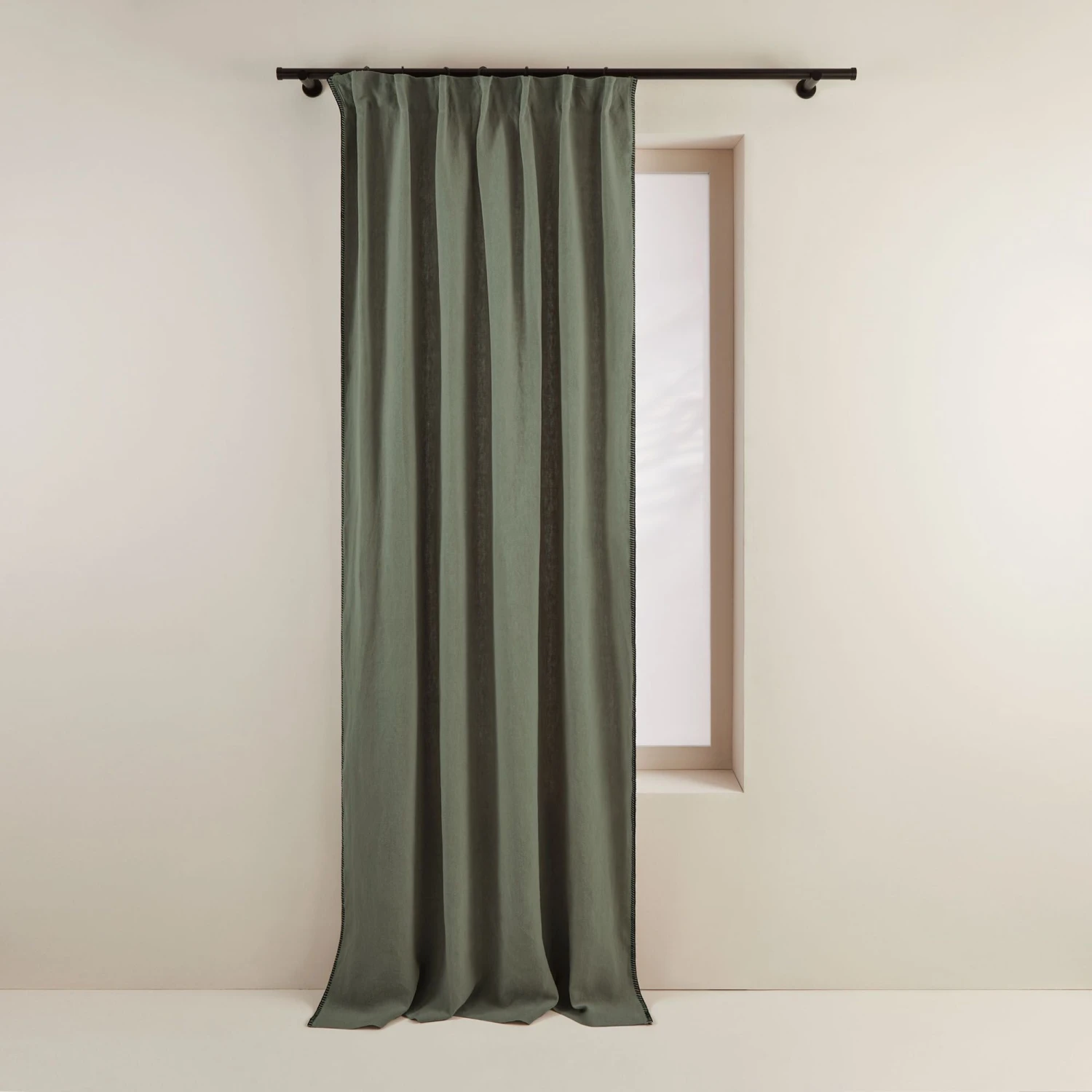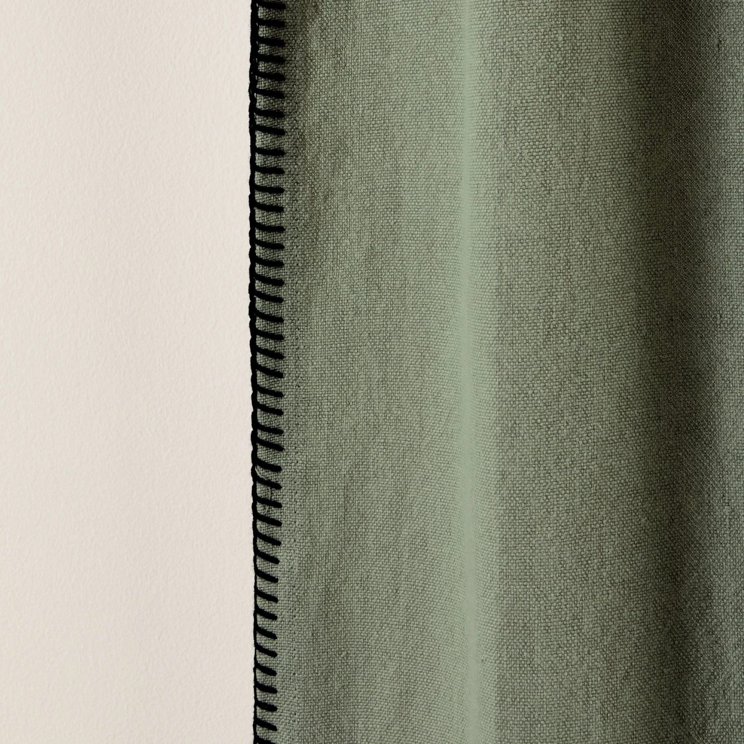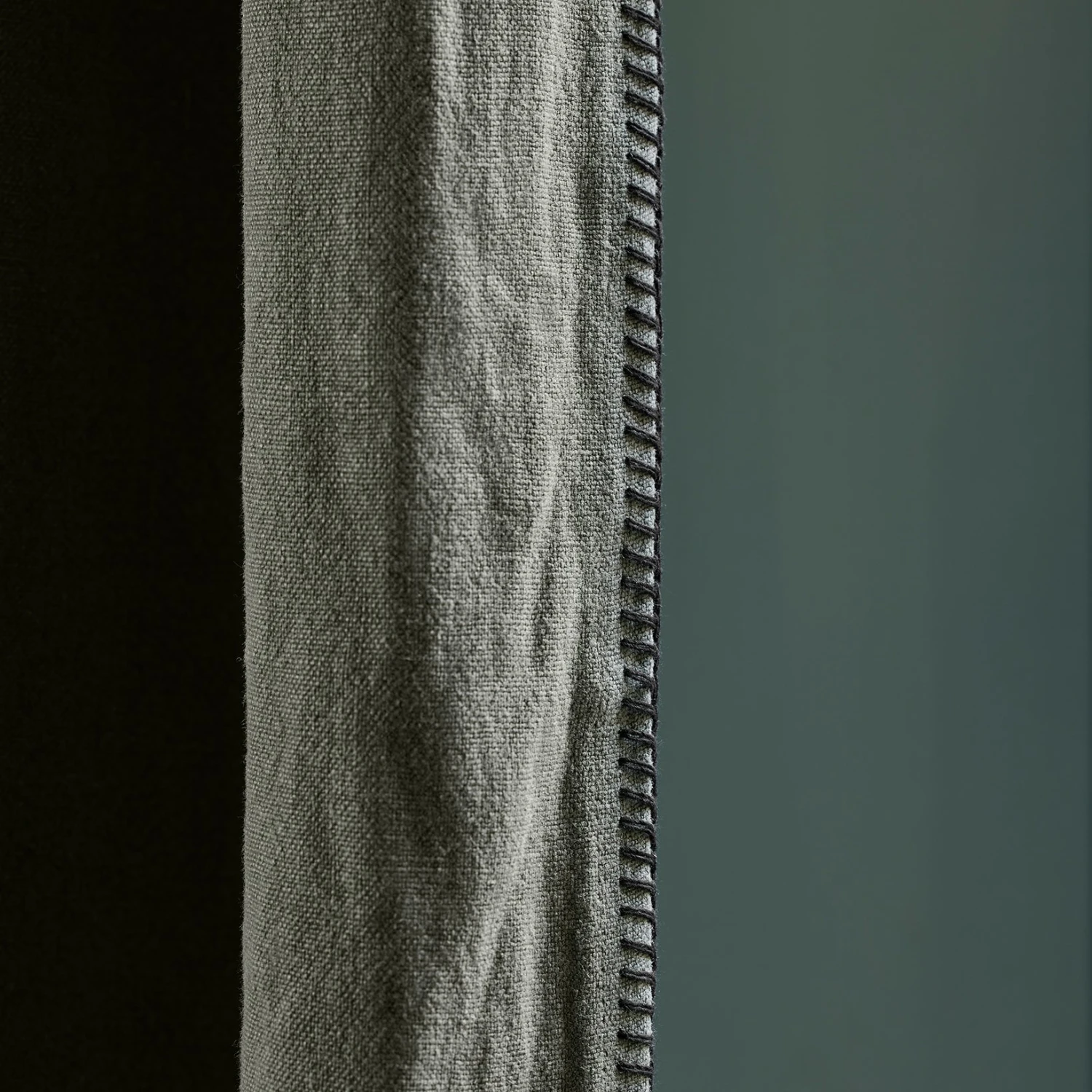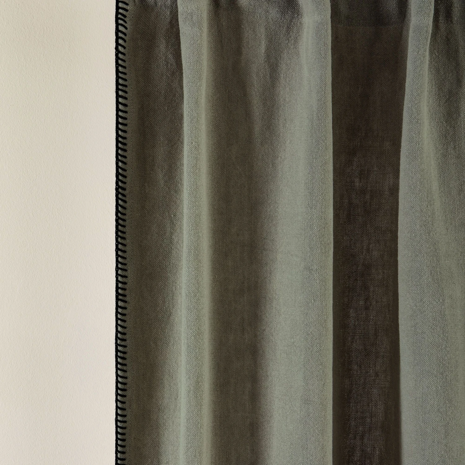 Contrasté d’un point de feston noir, le rideau à galon fronceur Nino kaki grisé insuffle un esprit brut et authentique grâce à son lin lavé épais.