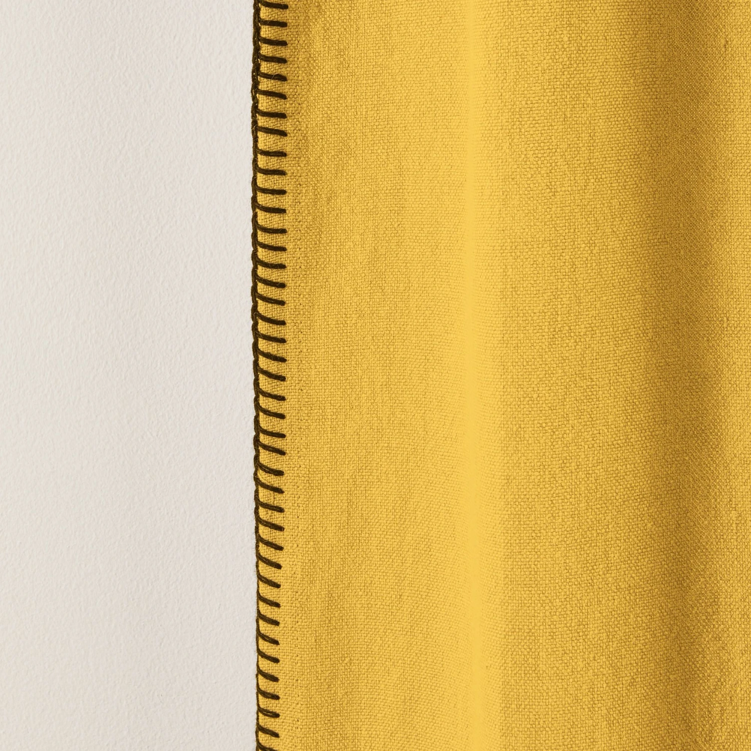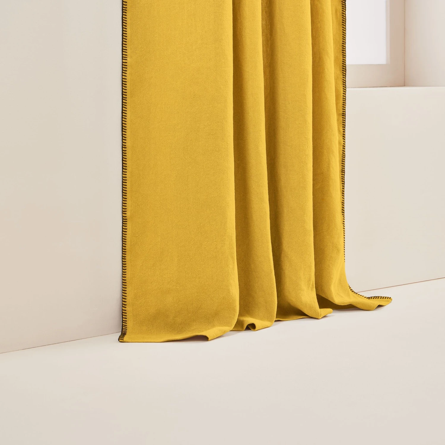 Contrasté d’un point de feston noir, le rideau à galon fronceur Nino ocre insuffle un esprit brut et authentique grâce à son lin lavé épais.