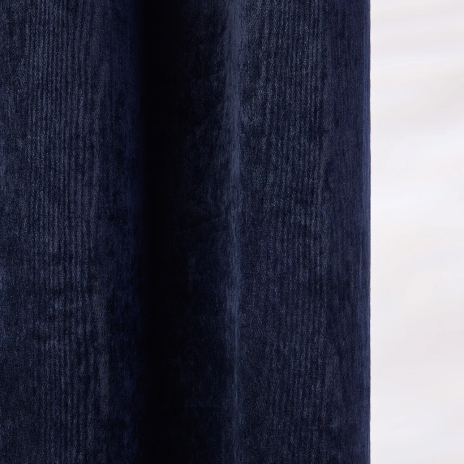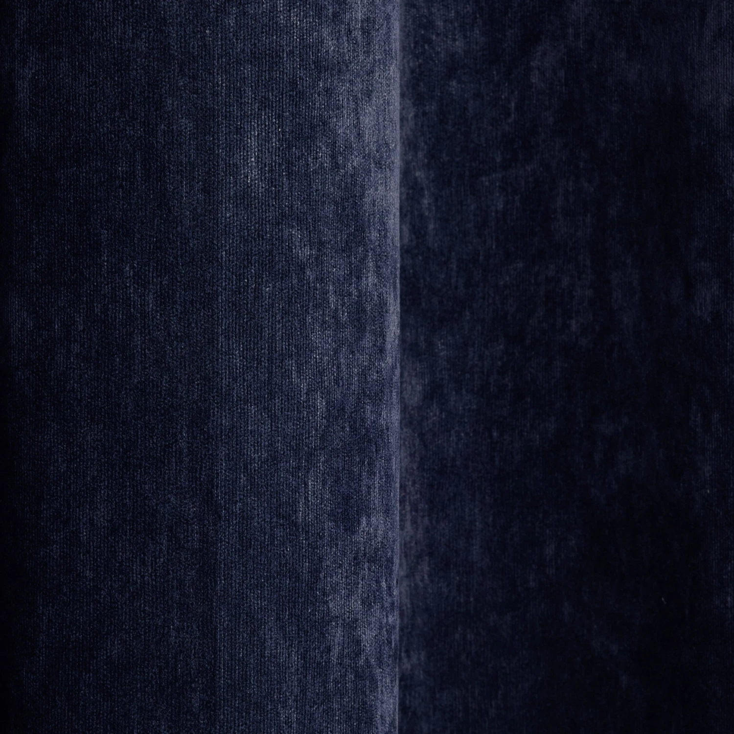 Avec son effet patiné, le rideau à oeillet Bazyl bleu noir en chenille est parfait pour décorer un salon à la fois enveloppant et confortable.
