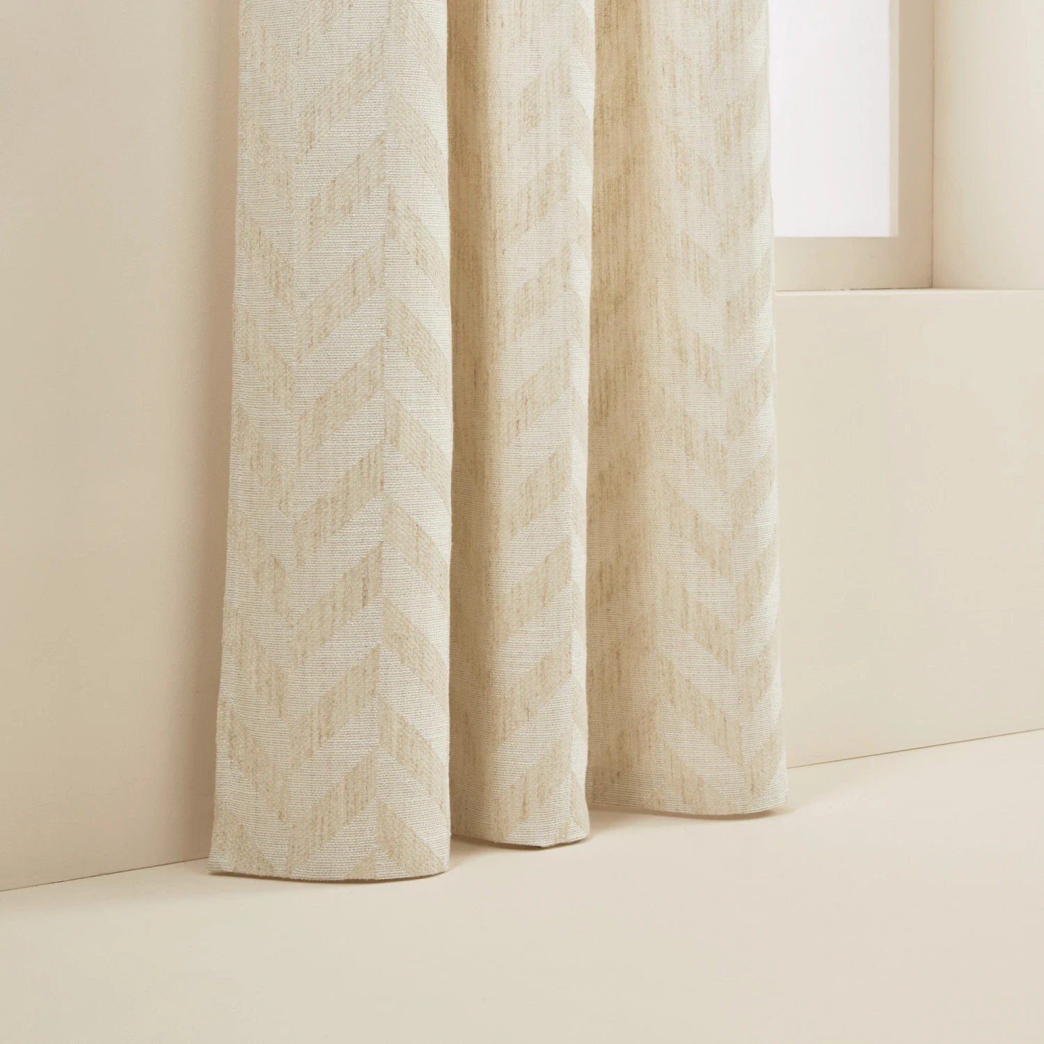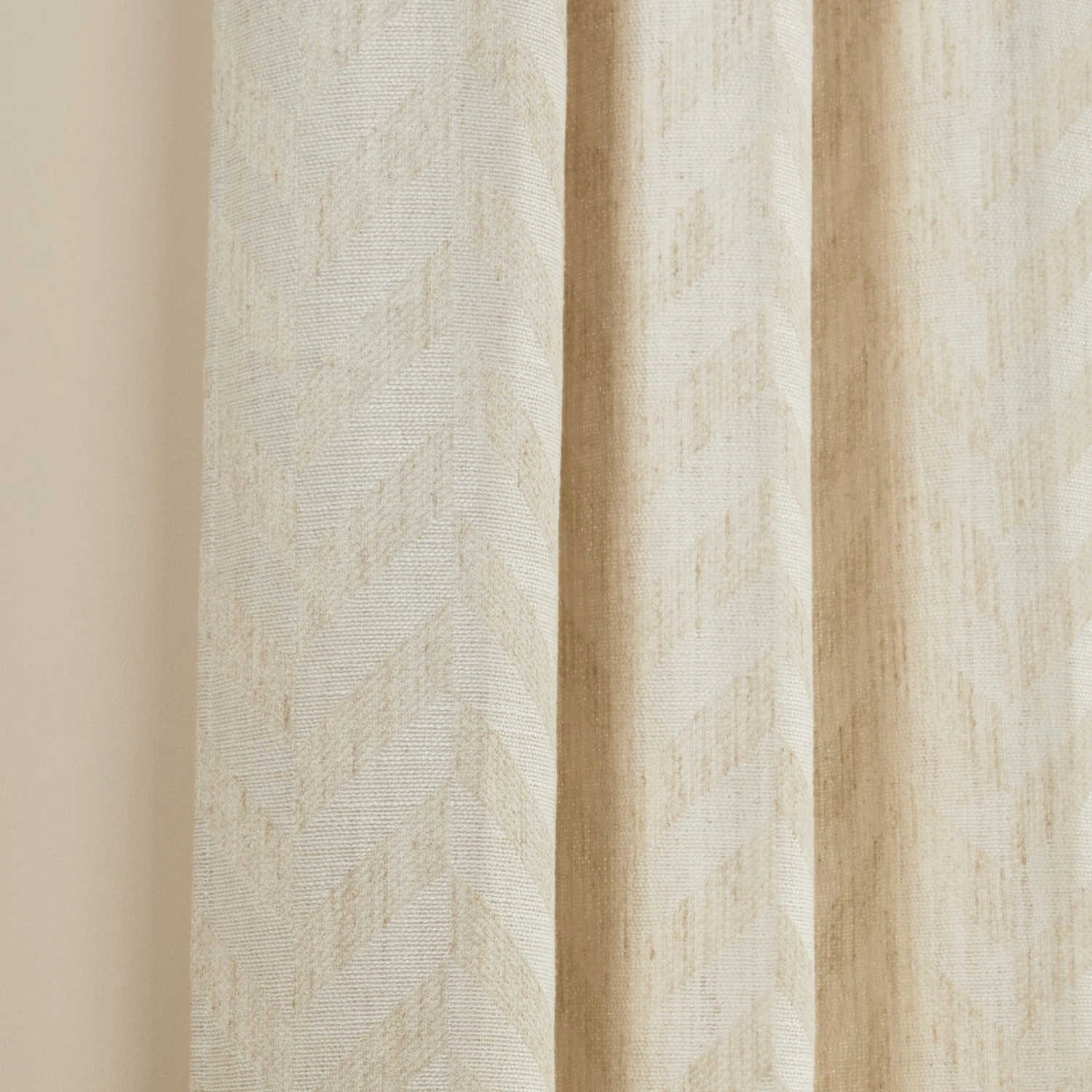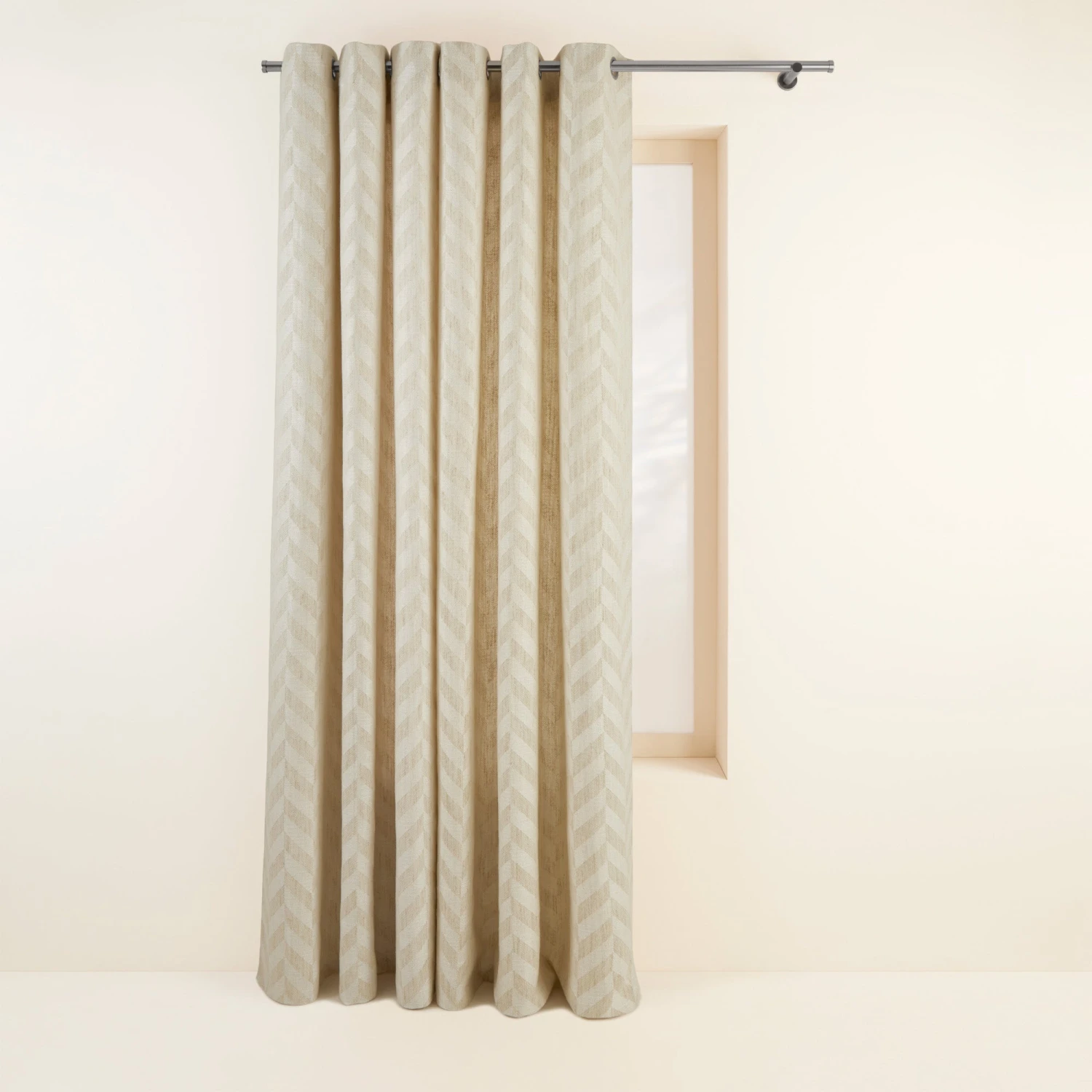 C’est dans la beauté du tissage au style naturel que se dessine un élégant chevron XXL. L’assemblage des textures aux fils méchés forme le motif graphique tout en subtilité et donne à ce rideau à oeillets un tombé parfait.
