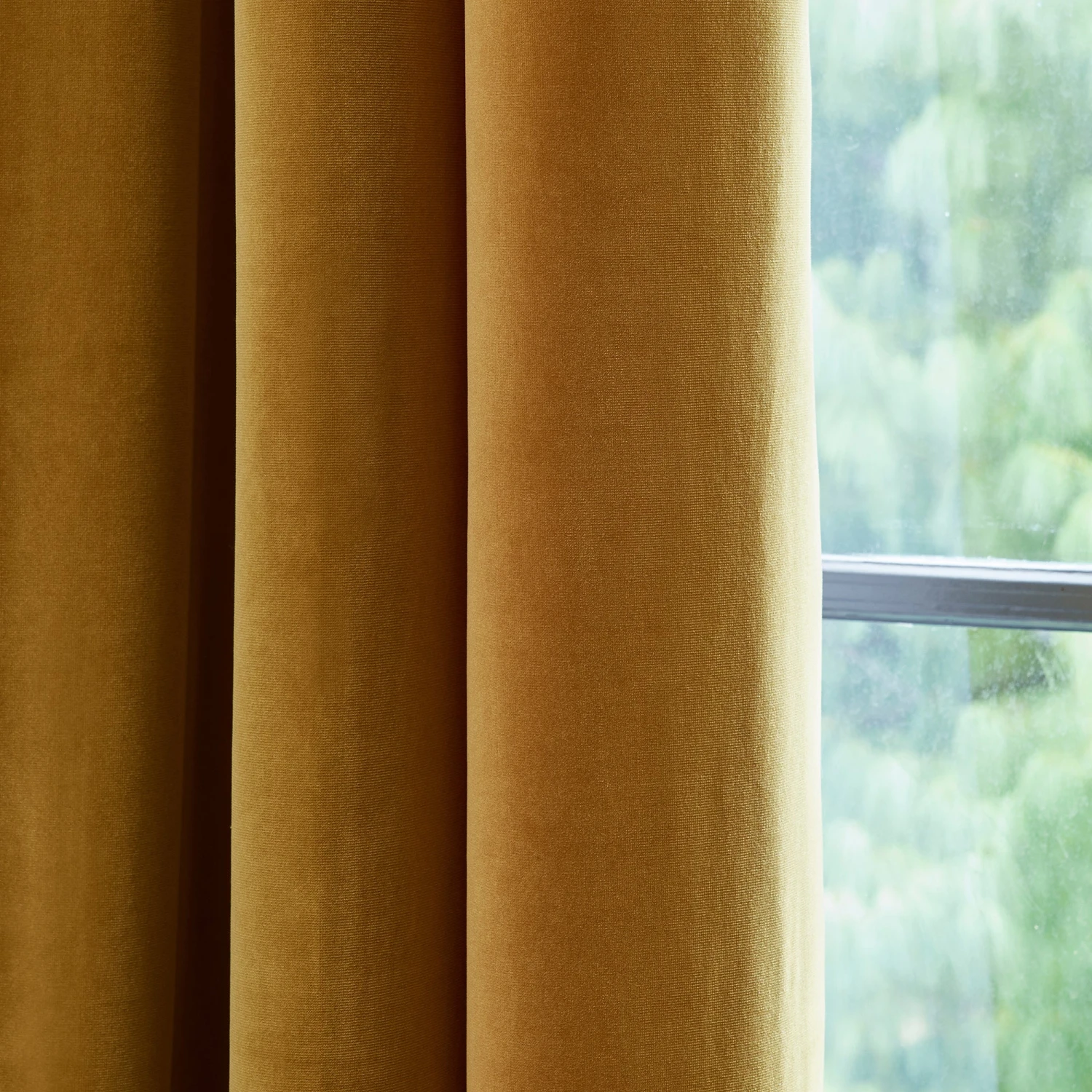 Le rideau en velours ras Matia capture la lumière et donne de subtils reflets mats aux teintes chaleureuses de son coloris ocre.