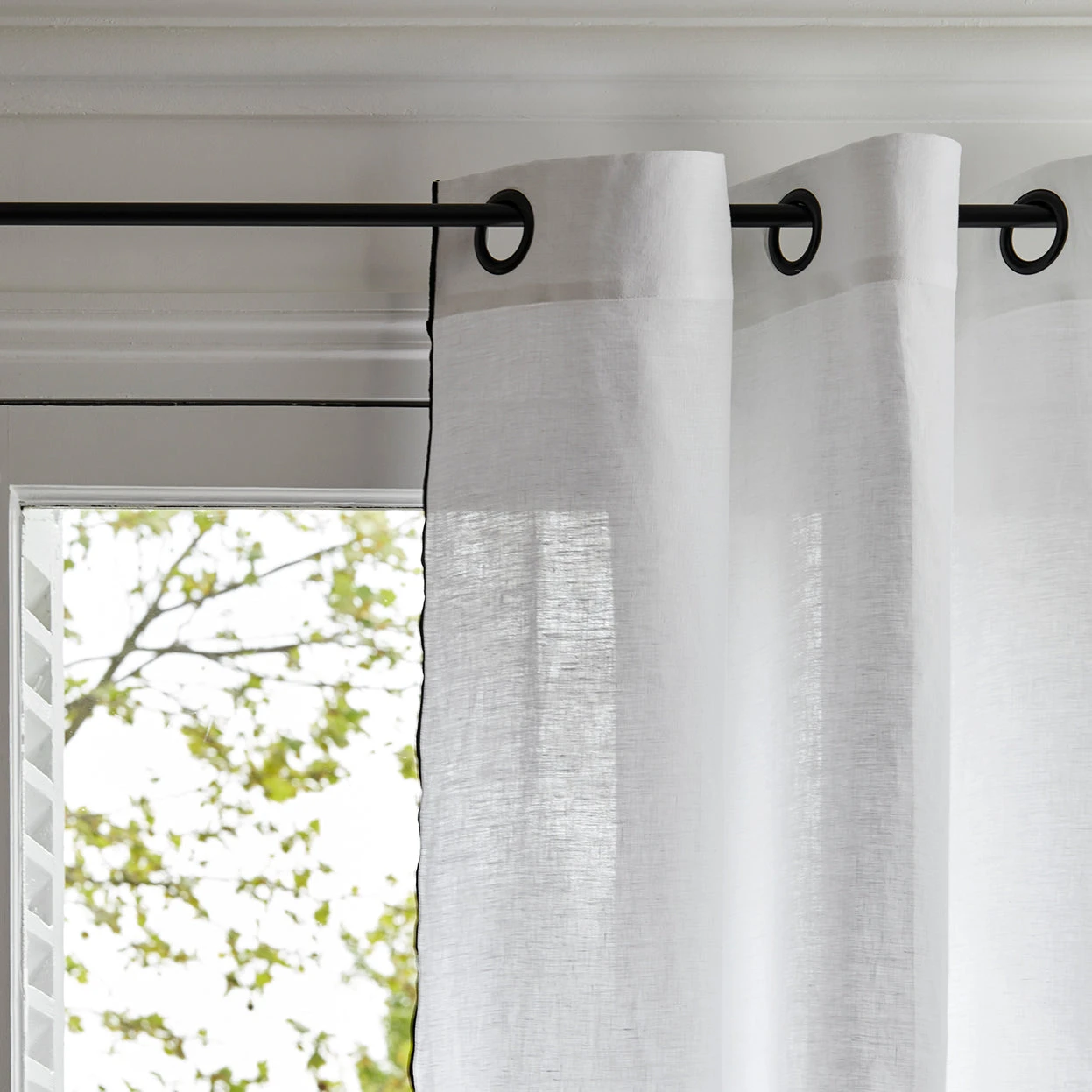 Le rideau à oeillets noirs Carlina blanc pur et bourdon noir est beau par son évidente simplicité. Réalisé avec des œillets noirs et souligné d’un point bourdon noir, ce rideau en lin léger s’installe facilement sur vos fenêtres et les habille d’une ondulation délicate au charme bohème.