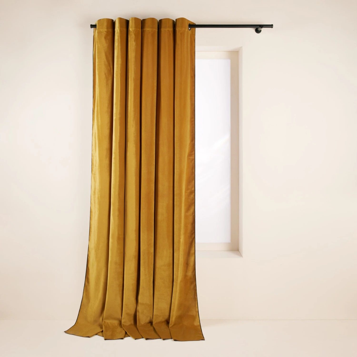 Le rideau à œillets dorés Dario est incontestablement élégant et chaleureux. On l’adore dans son coloris ocre souligné d’un bourdon noir apportant luminosité à cette matière duveteuse.