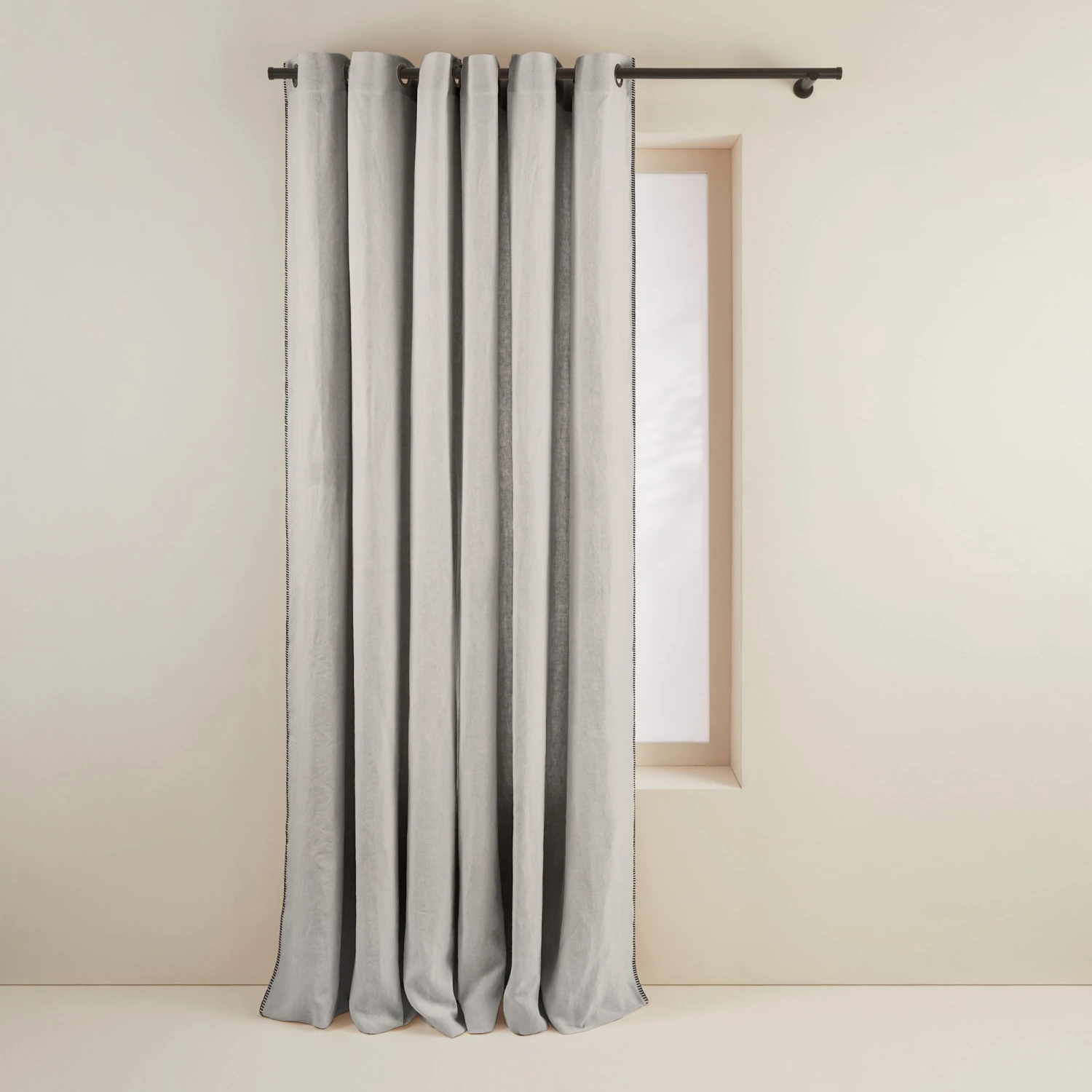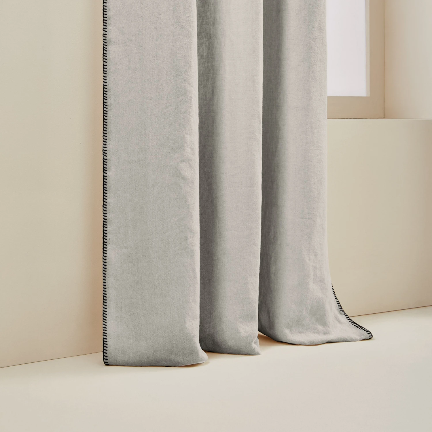 Contrasté d’un point de feston noir, le rideau à oeillets noirs Nino blanc minéral insuffle un esprit brut et authentique grâce à son lin lavé épais.