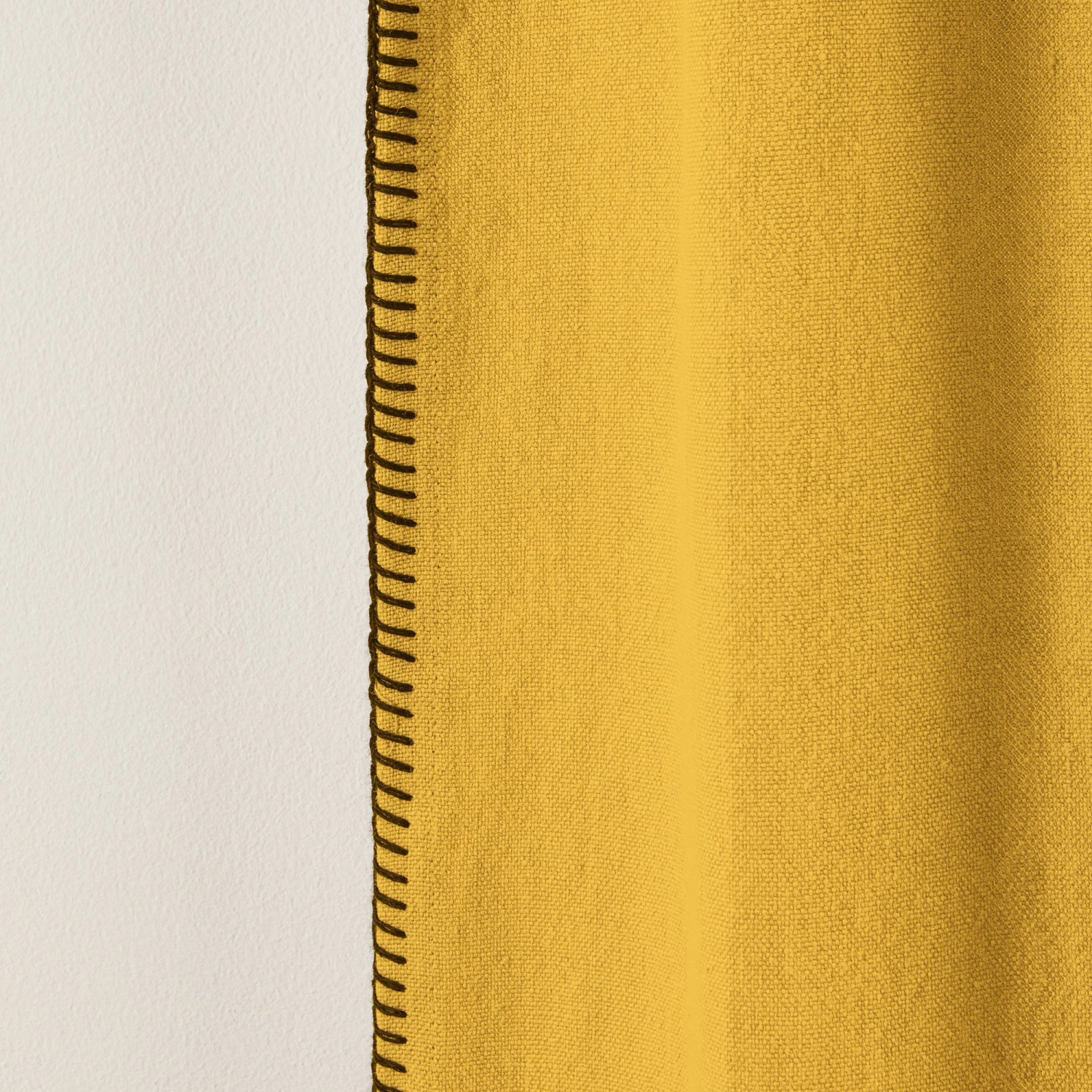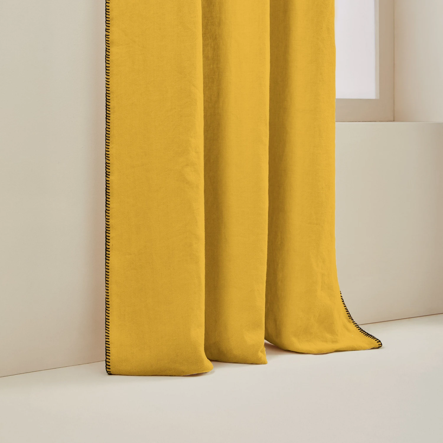 Contrasté d’un point de feston noir, le rideau à oeillets noirs Nino ocre insuffle un esprit brut et authentique grâce à son lin lavé épais.