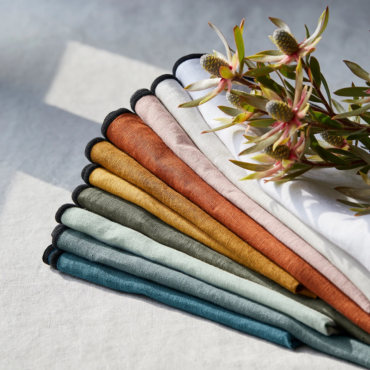 Lin lavé légèrement froissé, cette fibre 100% végétale est devenue incontournable et se décline en serviette, set et nappe pour créer une parure de table intégrale.