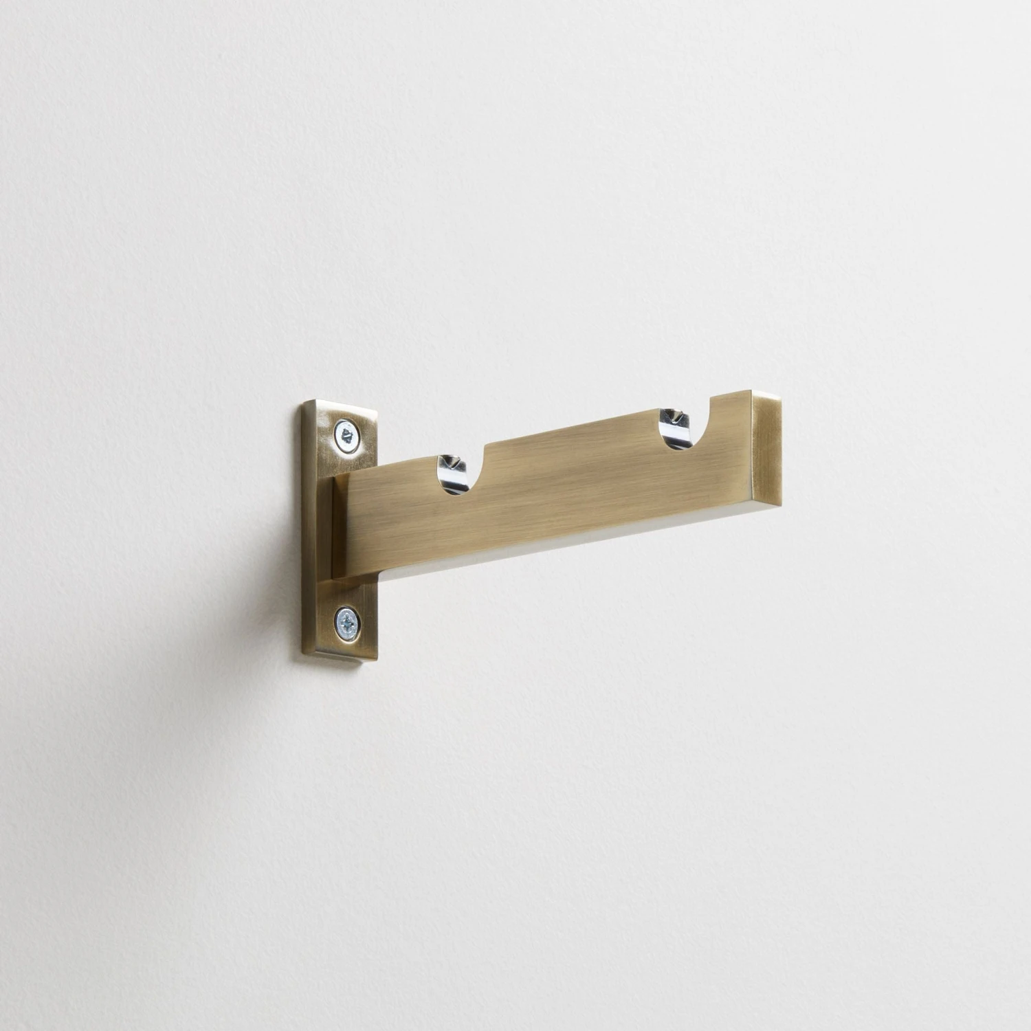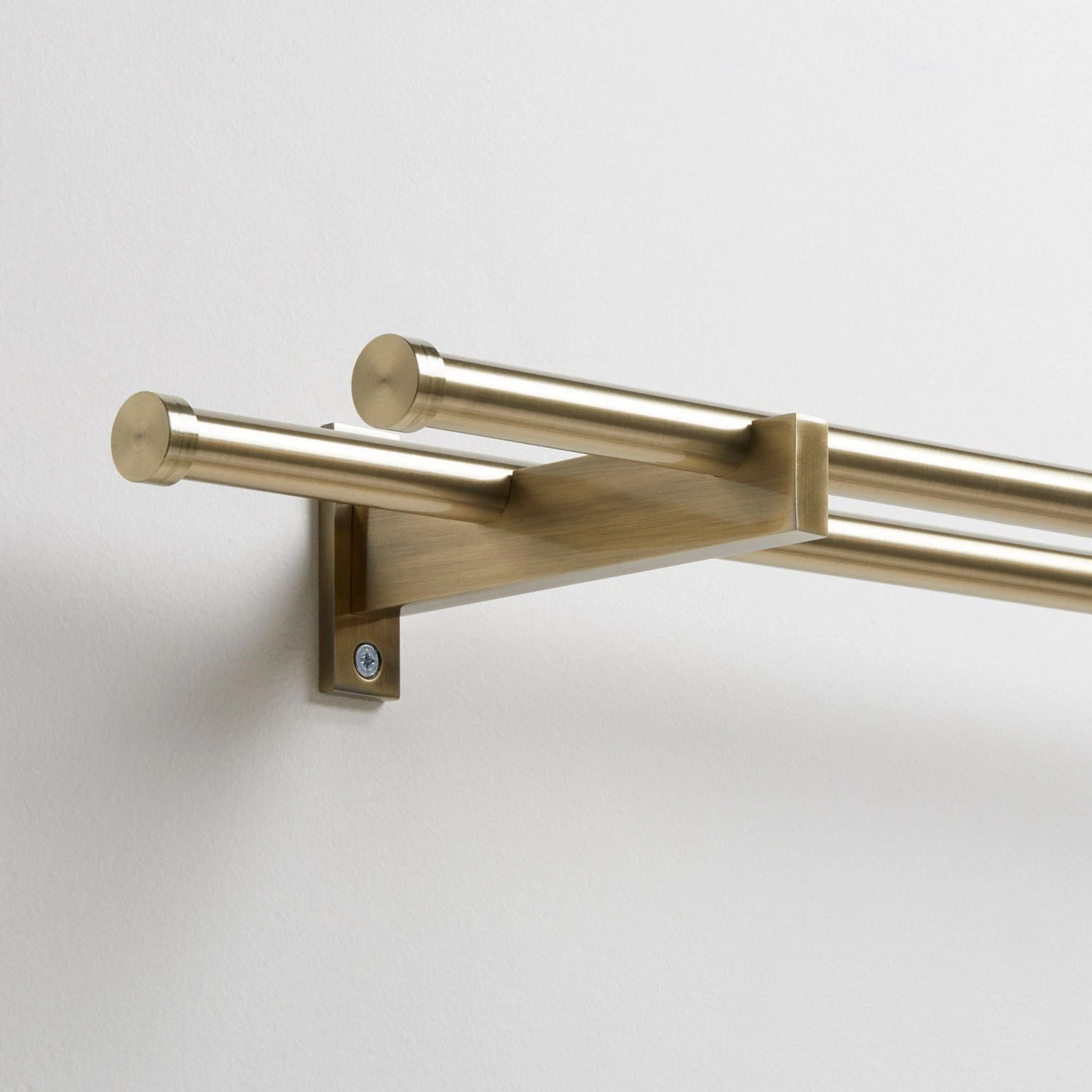 Ce support berceau double Alma au coloris laiton permet l’installation de deux tringles à rideaux, auto bloquées par des vis.