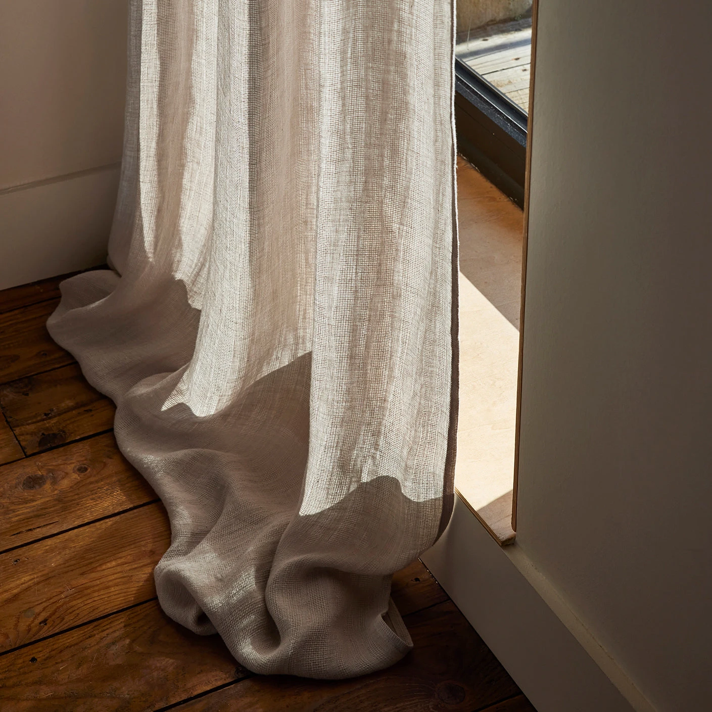 Le voilage Eole en chanvre lavé, avec son coloris naturel, se démarque par sa jolie finition frangée. Présente sur le bord haut et bas de votre pan, elle ajoute un petit air bohème. Le tissage aéré laisse passer la lumière tout en préservant votre intimité.