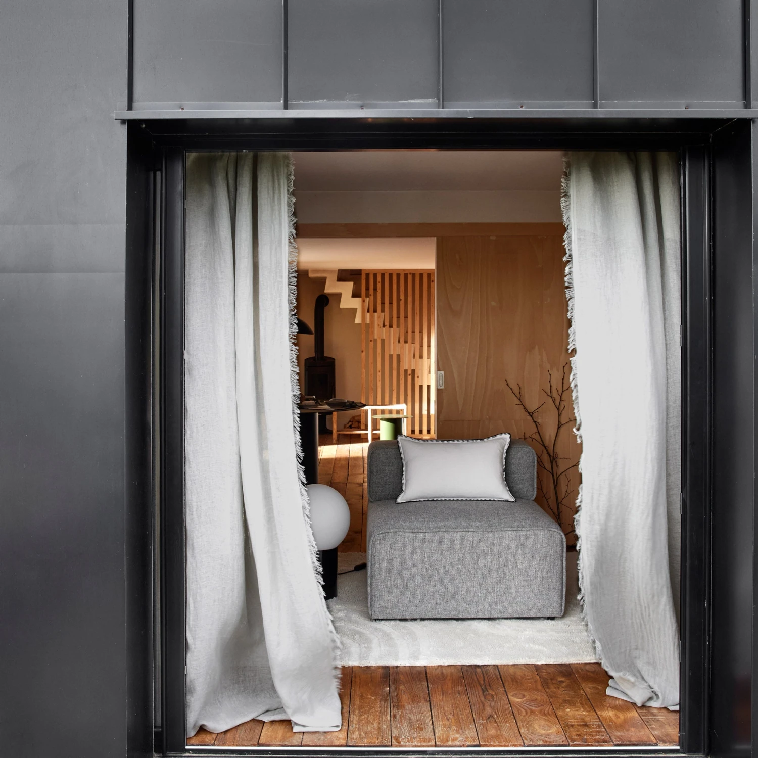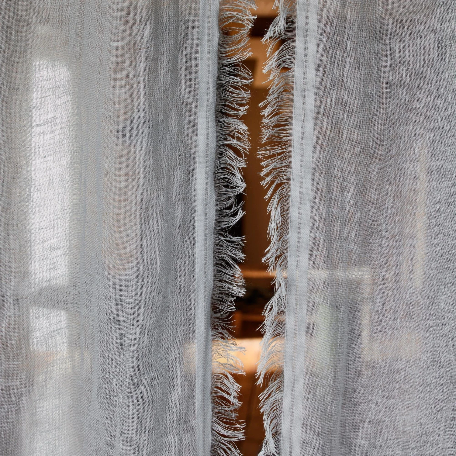 Bohème, léger comme l’air, le voilage Ikaria gris céleste en 100% lin semble tout droit venir d’Ibiza.