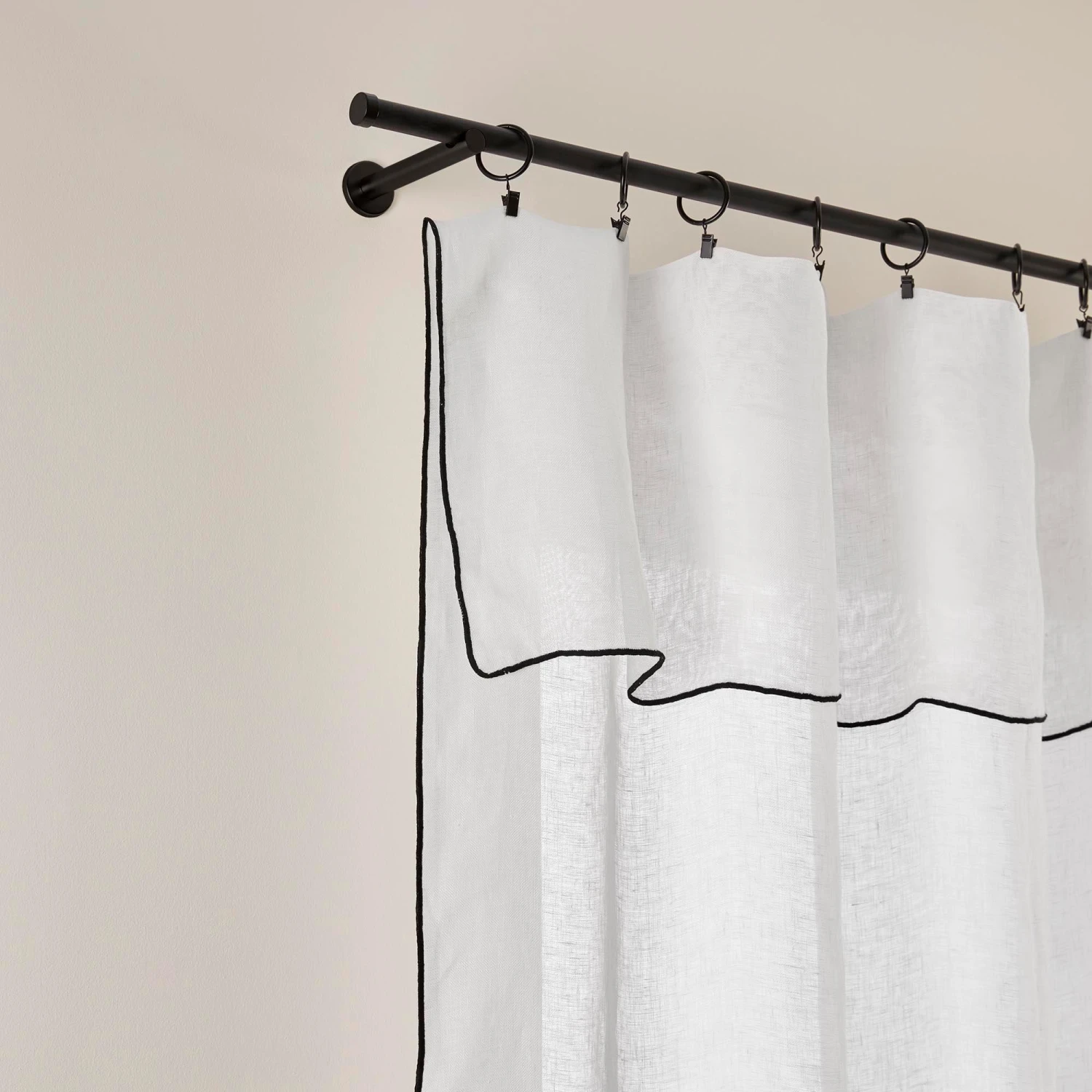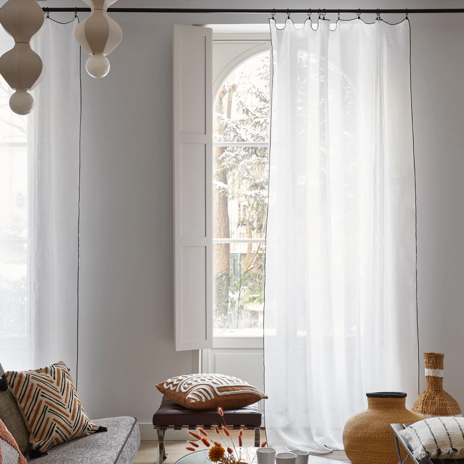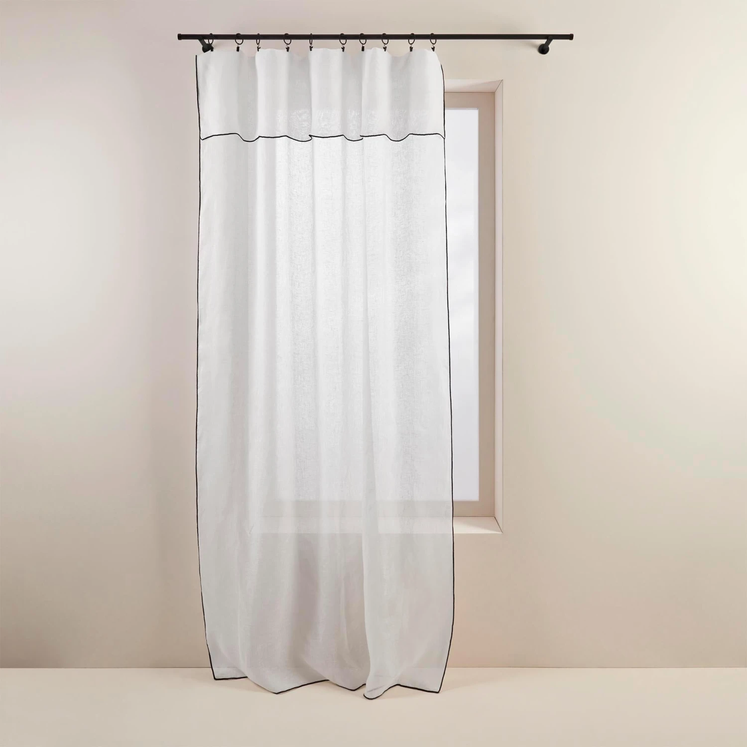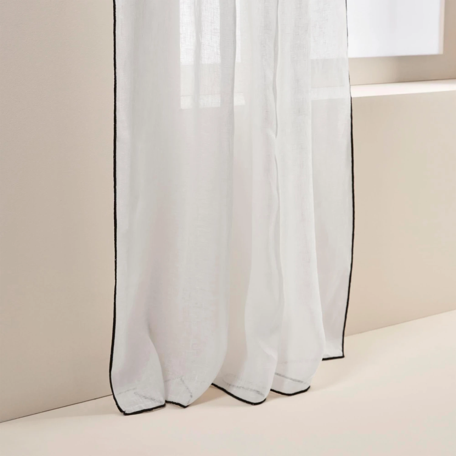 Léger et aérien, c’est en toute discrétion que le panneau Shadow en lin blanc pur au fini d’un point bourdon contrasté noir, se fond sur vos fenêtres.
